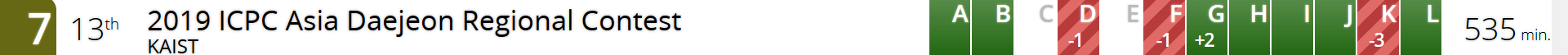 2019 ICPC Asia Daejeon Regional Contest라는 엄청난 팀명으로 다녀왔습니다. 여기저기 팀명 적어야 할 때마다 좀 고생했네요()