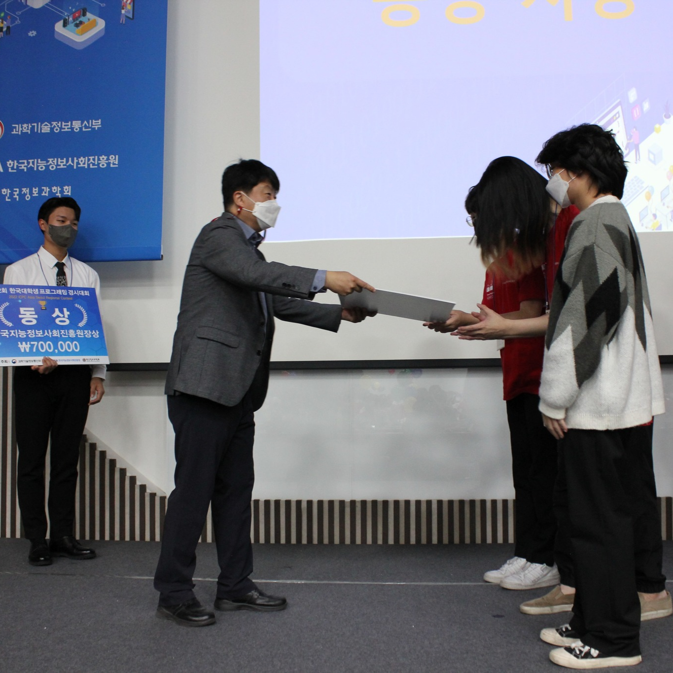 스코어보드 개봉에서 저희 팀은(당연하게도)문제를 계속해서 맞으면서 순위가 쭉쭉 올라갔고, 20등 후반대에서 출발한 순위는 7등까지 올라갔습니다. 대회가 끝난 뒤로는 해봐야 장려정도 나오지 않았을까 하는 분위기였고, 가장 희망적인 예상도 한 8등 9등 언저리였는데, 9솔브를 한 팀이 생각 이상으로 적었어서 패널티가 아주 많음에도 7등으로 여유롭게 동상 수상에 성공했습니다!