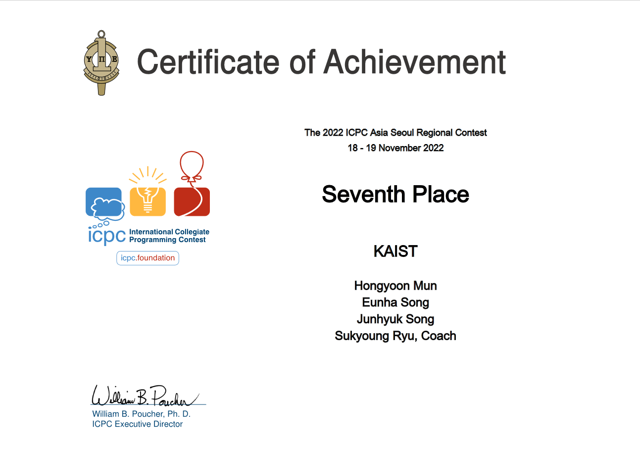 대강 팀원들끼리 밥을 먹으면서 제가 적어도 내년까지는 졸업하지 않을 것이고, 나머지 두 친구들도 올해 새내기라 시간이 많고, 딱히 내년에 카이스트로 들어올만한 사람 중에서 제 자리에 더 적합한 사람이 없다는 결론이 내려져서, 별 일이 없다면 내년에도 이 팀 멤버 그대로 출전하지 않을까 생각합니다. 이런 멋진 팀원들과 1년을 같이 했다는 것만으로도 충분히 기쁜데, 내년에도 또 나가게 된다면 저로서는 영광스럽기 그지 없네요. 그와는 별개로, 팀명이 계속 유지될지는 모르겠습니다. ㅋㅋㅋ...