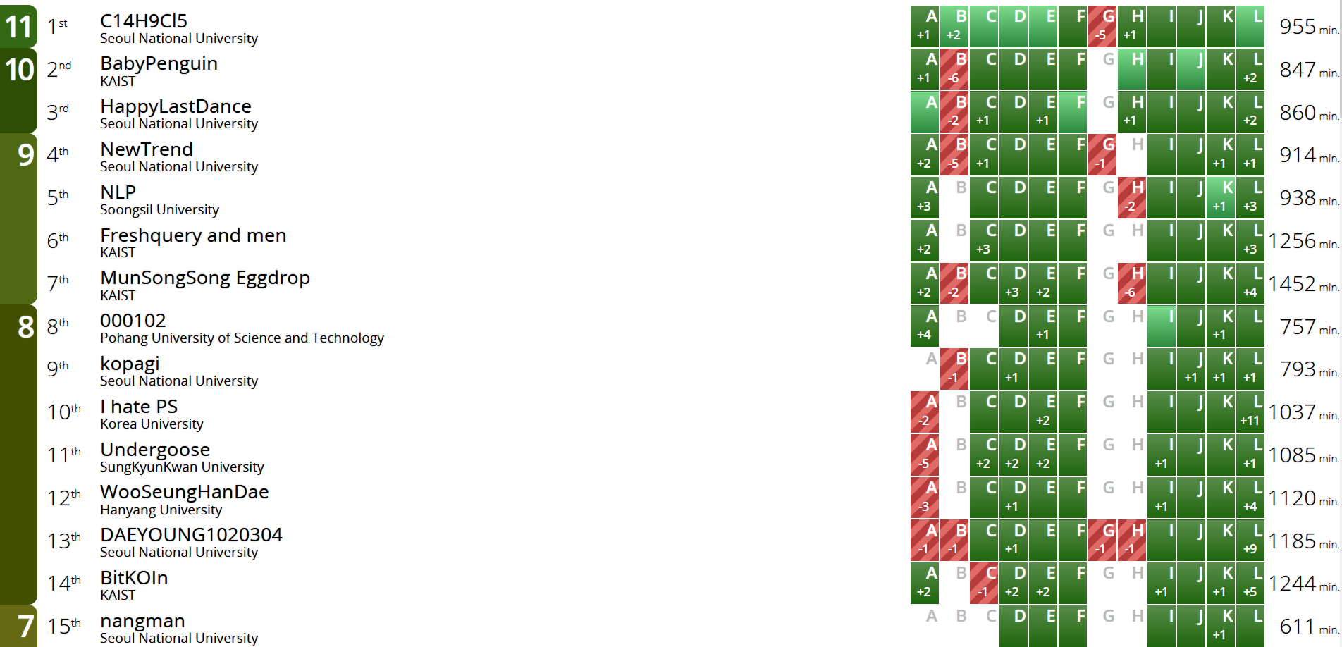 전체 1등은 무려 3년 연속 우승을 달리고 있는 C14H9Cl5팀이, 교내 1등은 작년에 월파 문턱에서 쓴 고배를 마셨던 BabyPenguin 팀이 차지했습니다. 두 팀 모두 진심으로 축하드립니다!