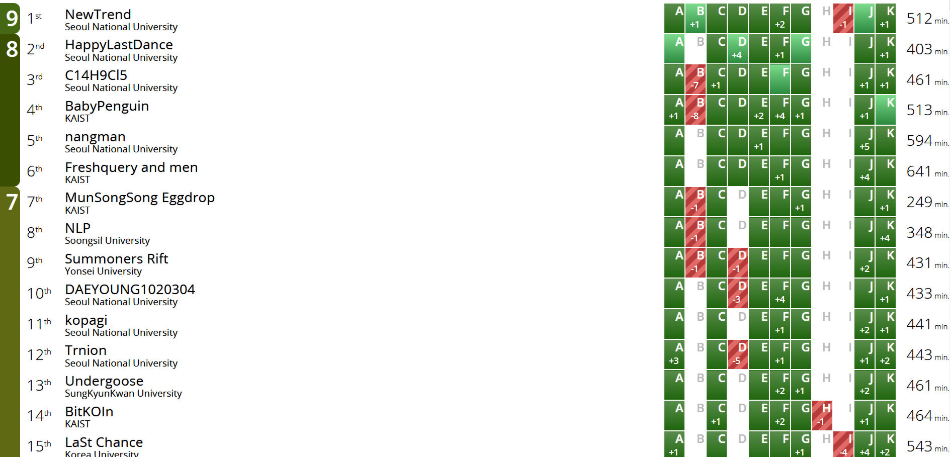 예선은 학교에서 치뤘습니다. 초반에는 문제들을 아주 빠른속도로 해치우면서 잠시간 1등을 달리기도 했고, 꽤 오랫동안 높은 순위를 유지했지만 결국 D를 해결하지 못해 7솔브에 머물렀고, 7솔브한 팀들 중에서는 1등을 했습니다.