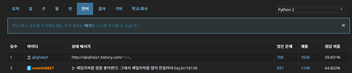 그렇지만 이후로도 버릇 못 고치고 저는 계속해서 Python만을 고집했습니다. 그렇게 해서, 지금 BOJ에서 푼 문제들도 대부분 Python으로 풀었고, 언어별 랭킹은 Python2가 지원 중지되면서(고등학교 때 푼 문제들은 거진 Python 2입니다.)막 높지는 않지만, Python 2 랭킹을 들어가보면 제가 당당히 2등을 차지하고 있는 걸 볼 수 있습니다.