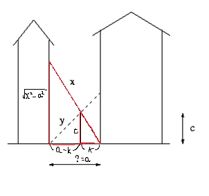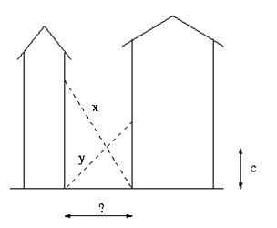 문제 자체는 아주 간단합니다. 위 그림에서 x, y, c가 주어졌을 때 두 건물 사이의 거리를 구하라는 문제예요.(조금 약화시킨다면)중학교 3학년 수학 응용 문제 정도로 나와도 괜찮을 정도라고 생각합니다.