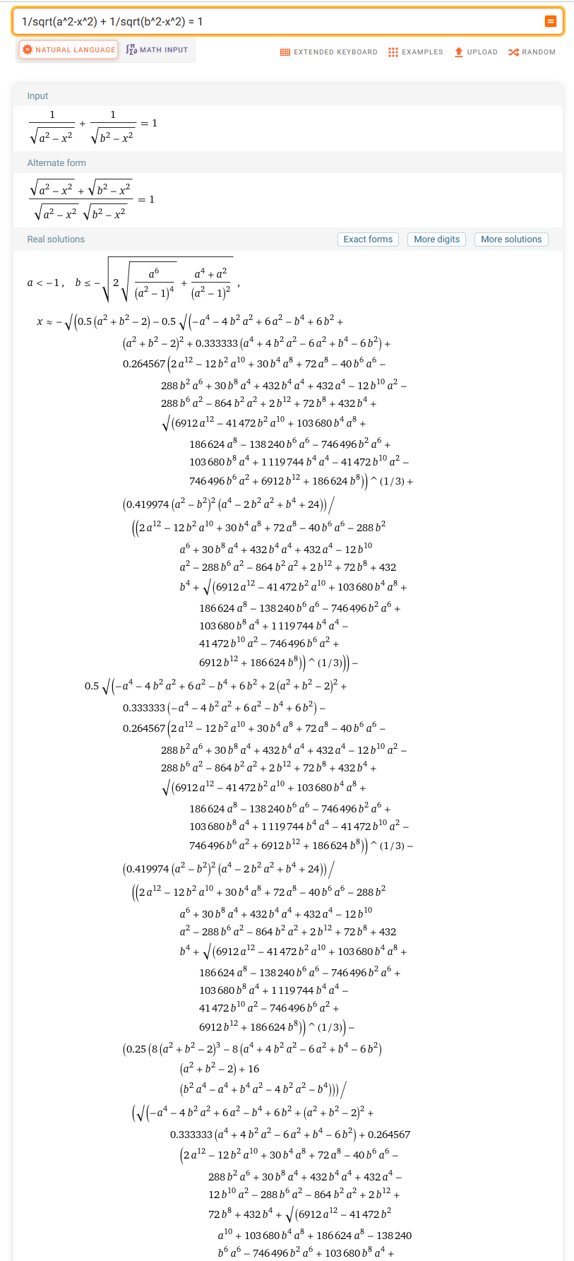 물론 수학적으로 이 방정식을 예쁘게 푸는 것은 결코 쉬운 일이 아닙니다. 울프람 알파 선생님께 한번 물어봤더니